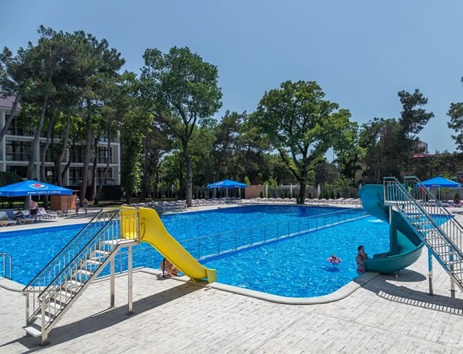 В санаторий можно приехать с ребёнком возрастом от года, лечение предоставляется детям с 4 лет. Для юных гостей на территории санатория работают детские комнаты с воспитателями, открытые бассейны с детскими отделениями, детские открытые площадки на двух береговых линиях, игровая зона на пляже, детская зона в крытом бассейне, в ресторане выделена детская зона с отдельной шведской линией, предоставляются детские стульчики для кормления
